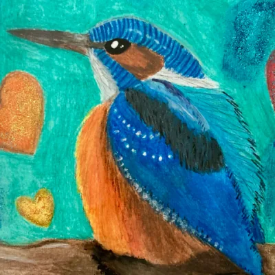 Neben Pinsel und Farbe verwende ich auch unterschiedliche Stifte aus dem Künstlerbedarf sowie Materialien wie Effektglitter, kombiniert mit Flüssig- oder Bastelkleber.